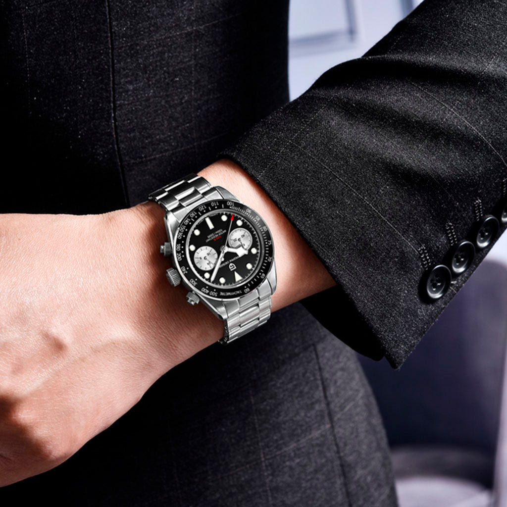 O Pagani Design Dash Black é fabricado com aço inoxidável 316L, um material antialérgico e altamente resistente à corrosão, oferecendo resistência, brilho e durabilidade excepcionais.