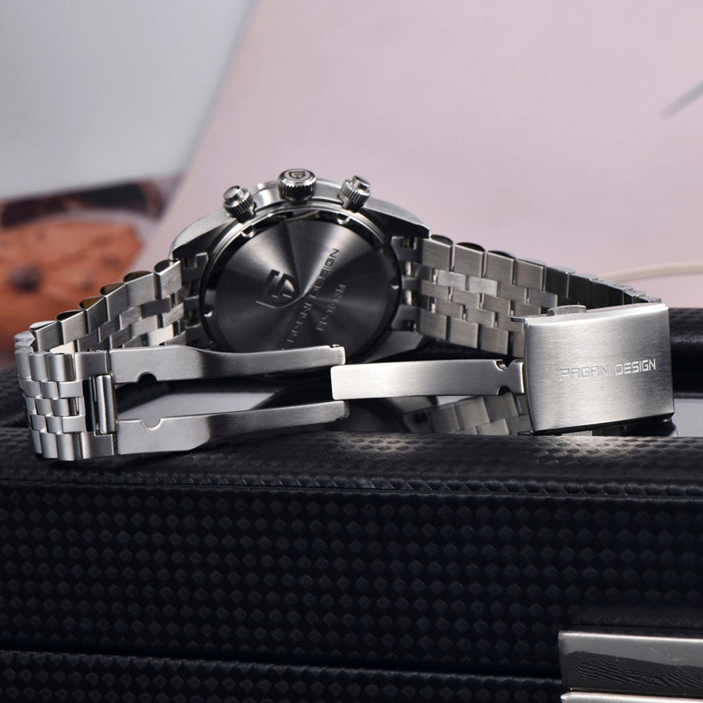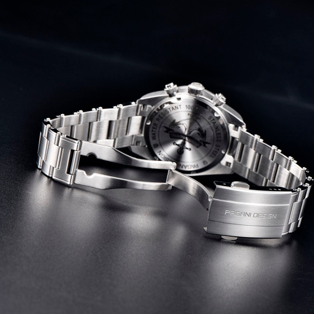 A pulseira do Pagani Design Dash White é cuidadosamente projetada com materiais premium, combinando a resistência e a leveza do aço inoxidável 316L. Proporciona um conforto incomparável e uma sensação única de estar usando um relógio quase imperceptível no pulso.