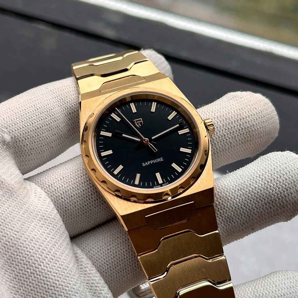 A pulseira do Pagani Design Drift Gold Black é cuidadosamente projetada com materiais premium, combinando a elegância e a resistência do aço 316L. Proporciona um conforto incomparável e uma sensação única de estar usando um relógio quase imperceptível no pulso.