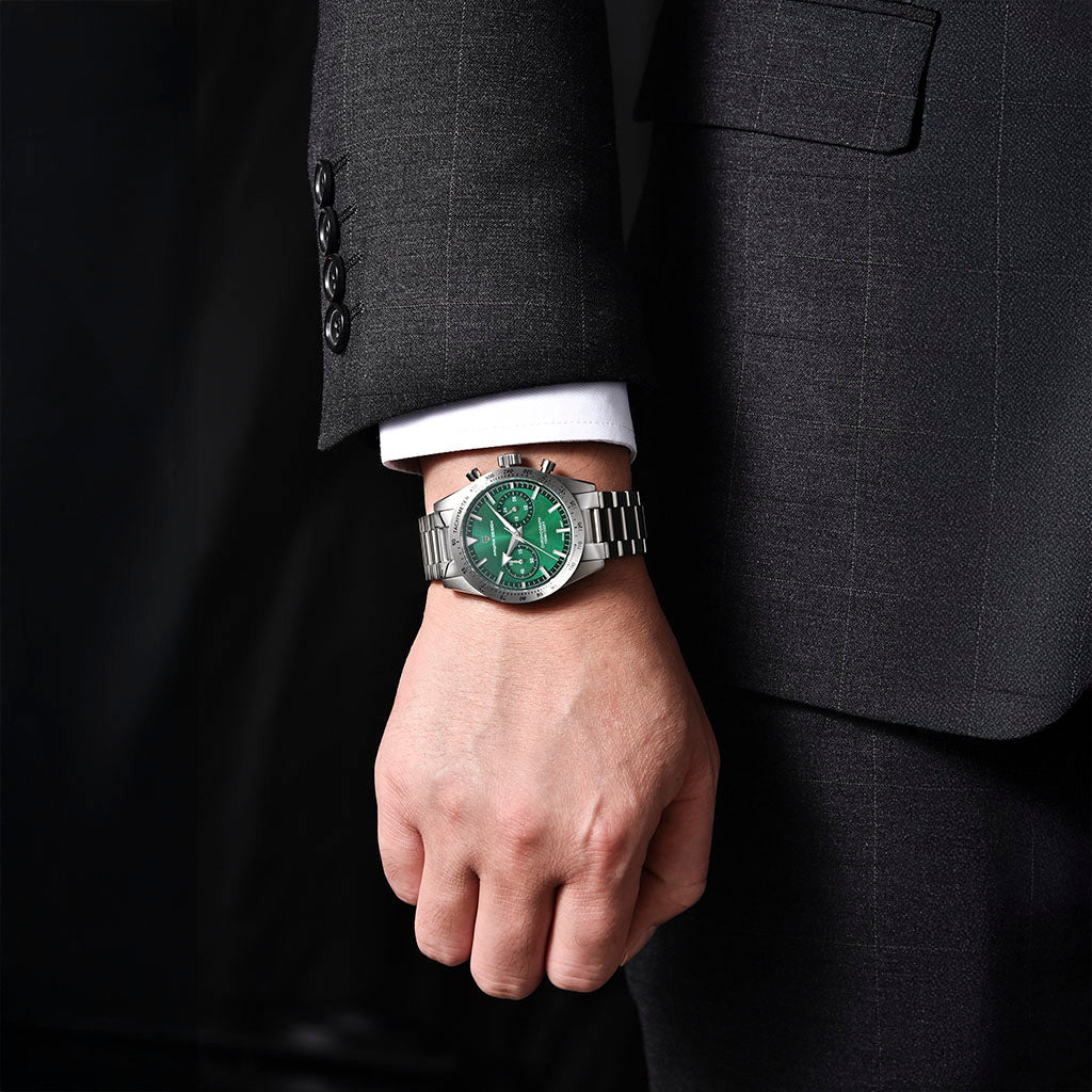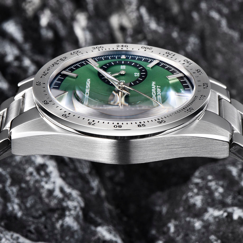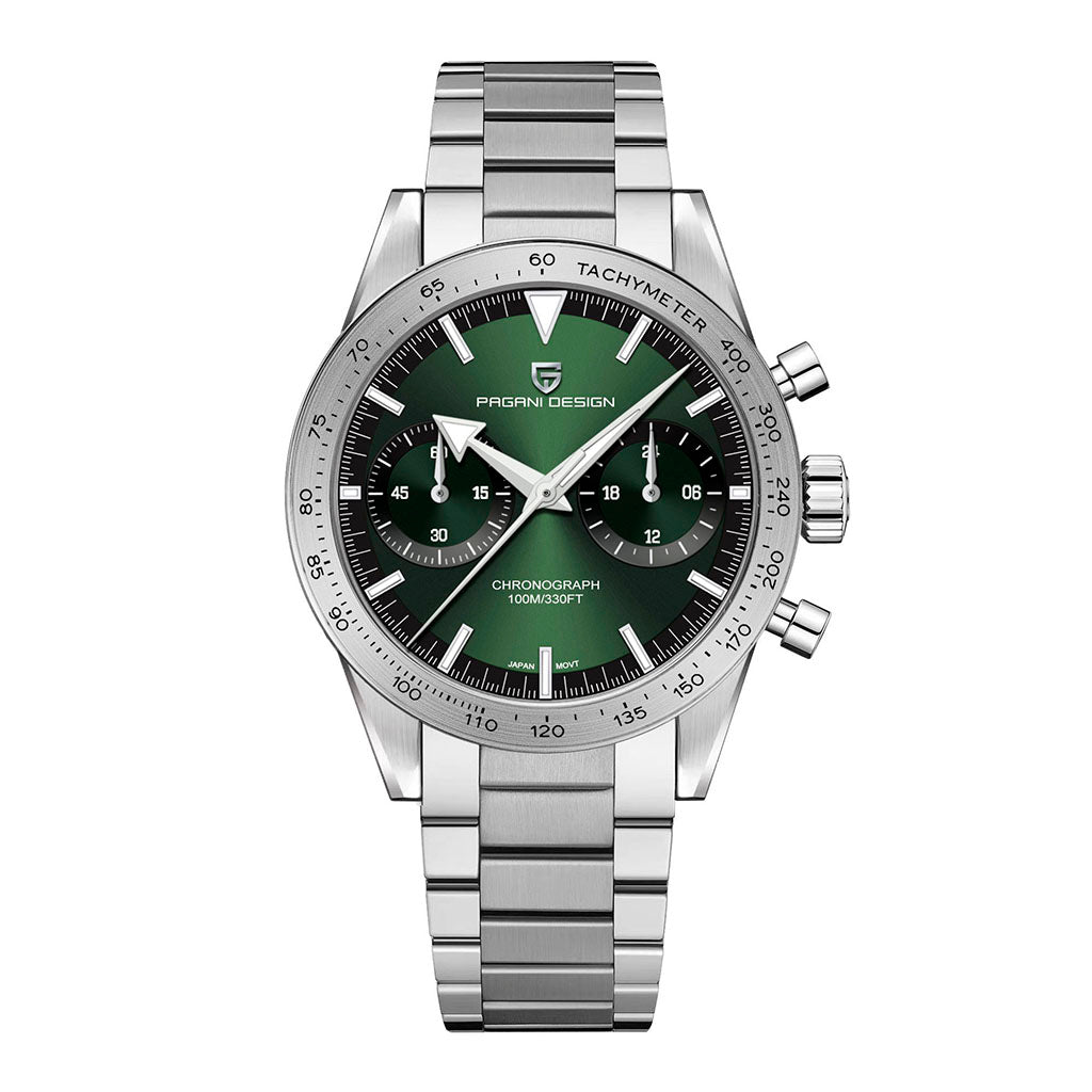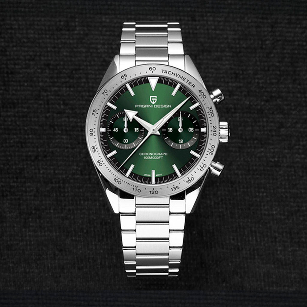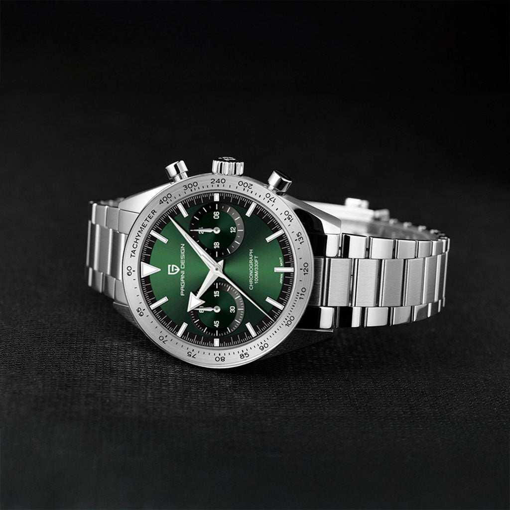 O movimento Seiko VK64 é conhecido por seu desempenho excepcional em termos de precisão e confiabilidade. O Pagani Design Drive Green equipado com o movimento VK64, possui uma operação suave e precisa do cronógrafo.