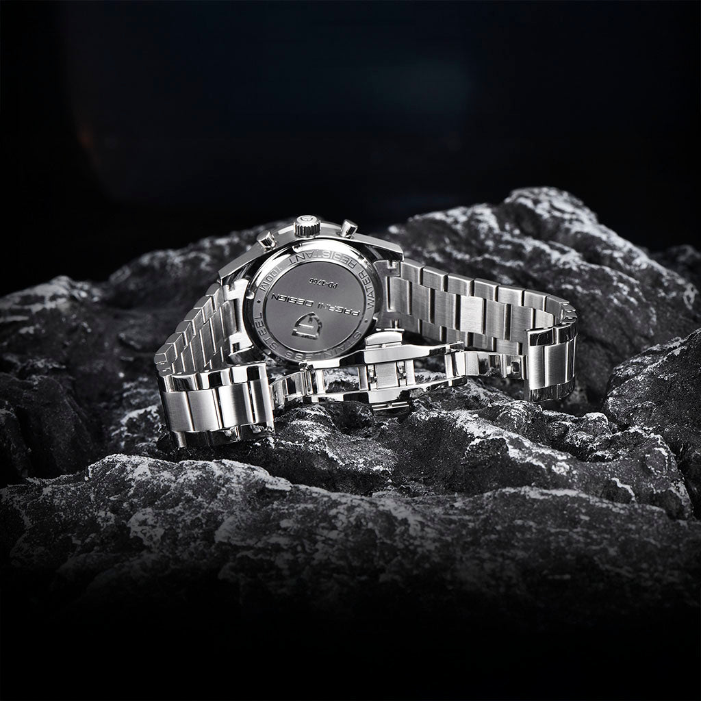 A pulseira do Pagani Design Drive Green é cuidadosamente projetada com materiais premium, combinando a resistência e leveza do aço inoxidável 316L. Proporciona um conforto incomparável e uma sensação única de estar usando um relógio quase imperceptível no pulso.