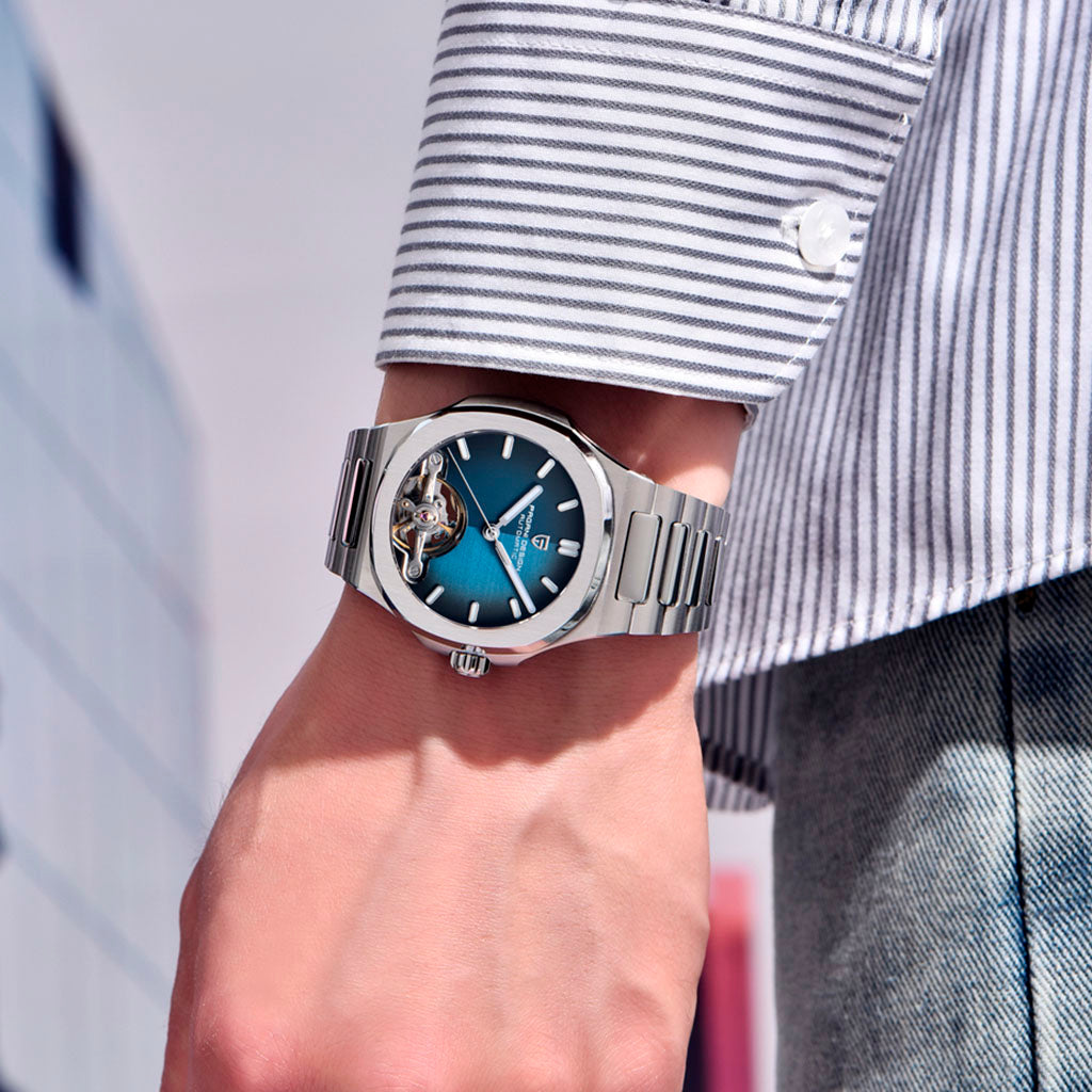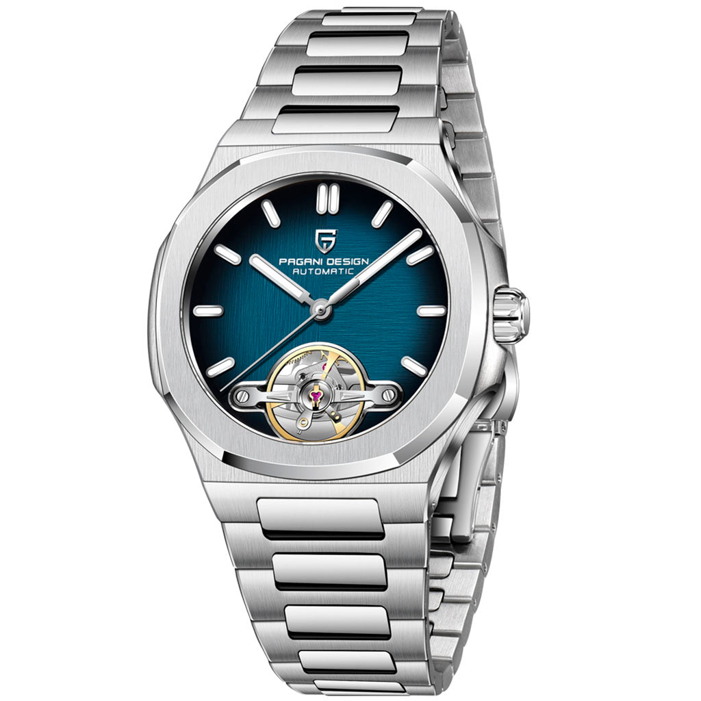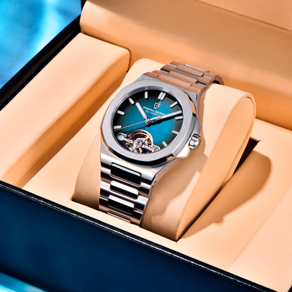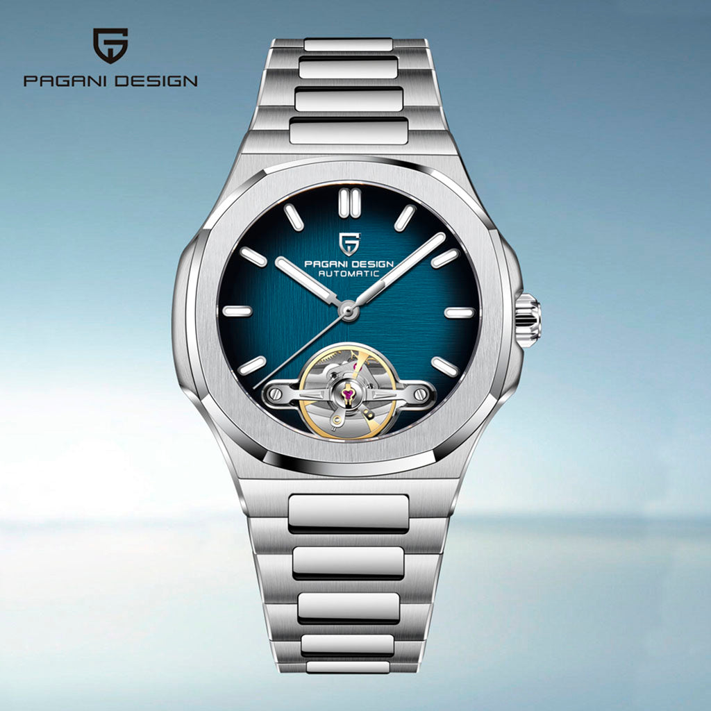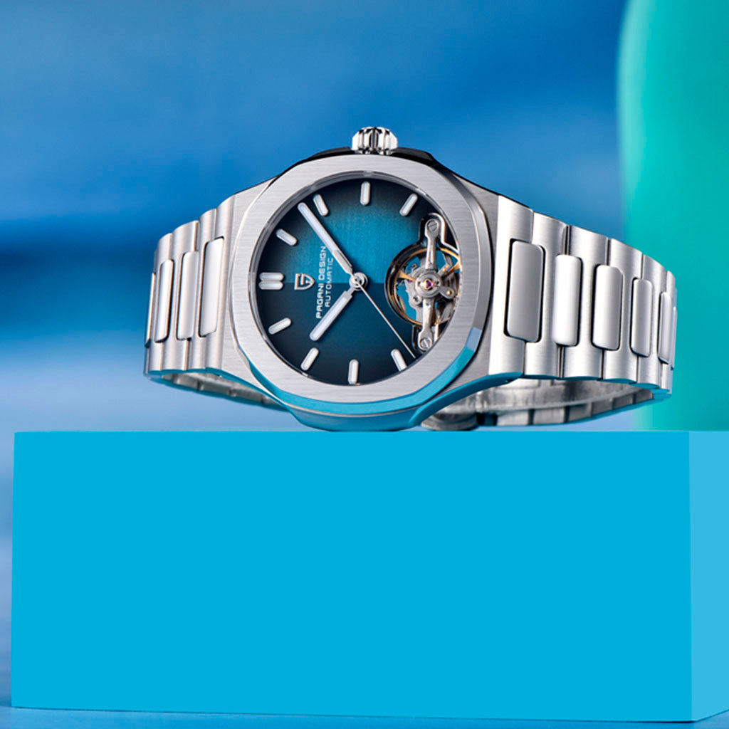 Resistência à água 100 m para natação e rotina urbana. A coroa rosqueada do Pagani Design Esposito Silver Blue garante vedação confiável — consulte o manual para cuidados.