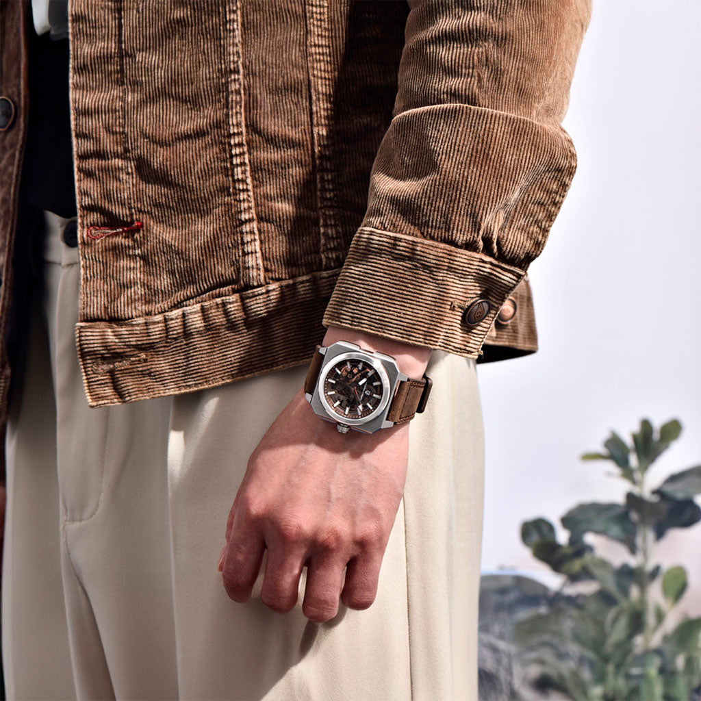 A pulseira do Pagani Design Factory Brown é cuidadosamente projetada com materiais premium, com toda a resistência e leveza do Couro. Proporciona um conforto incomparável e uma sensação única de estar usando um relógio quase imperceptível no pulso.