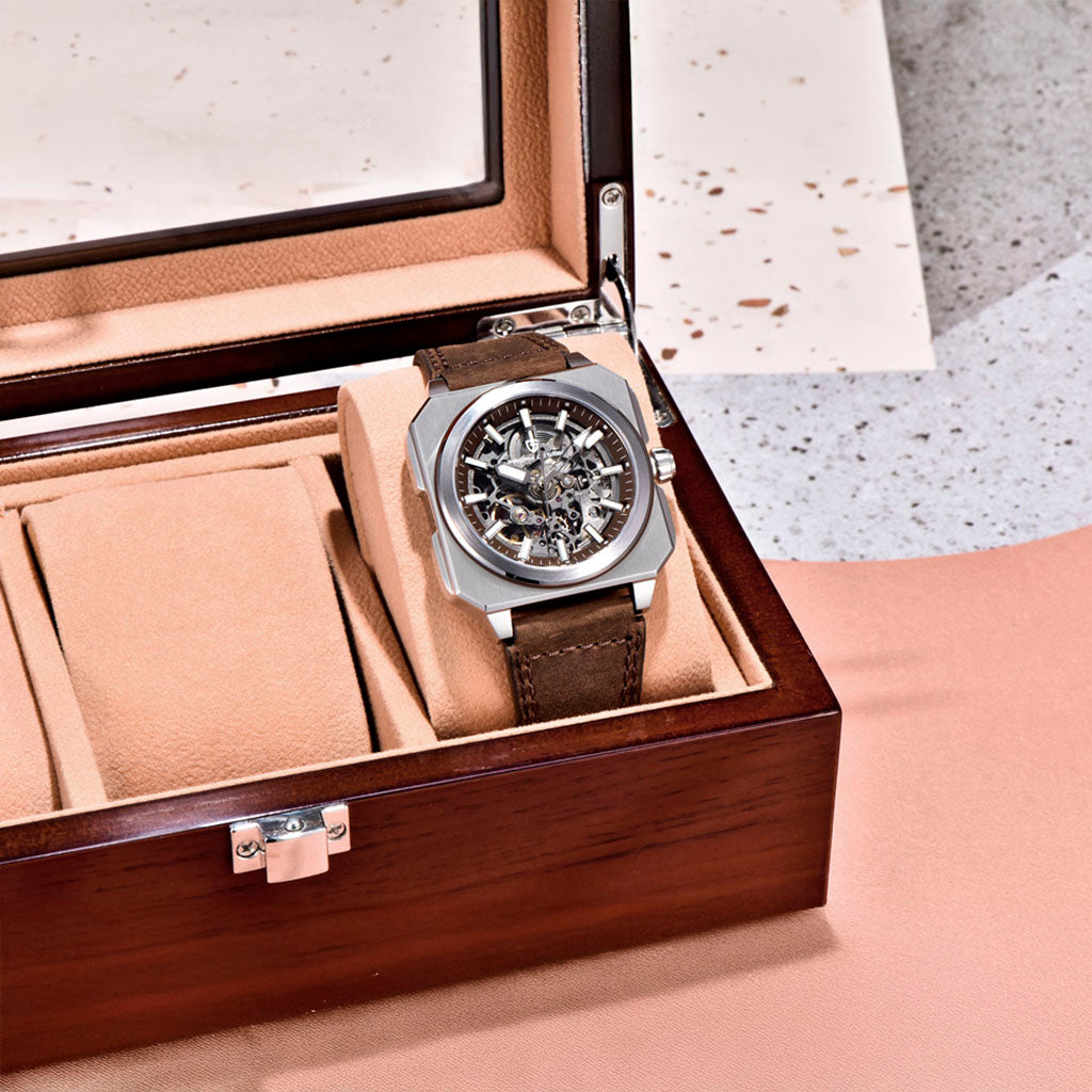 O relógio Pagani Design Factory Brown utiliza cristal de safira, um dos materiais mais prestigiados no mundo da alta relojoaria, conhecido por sua transparência e durabilidade excepcionais.