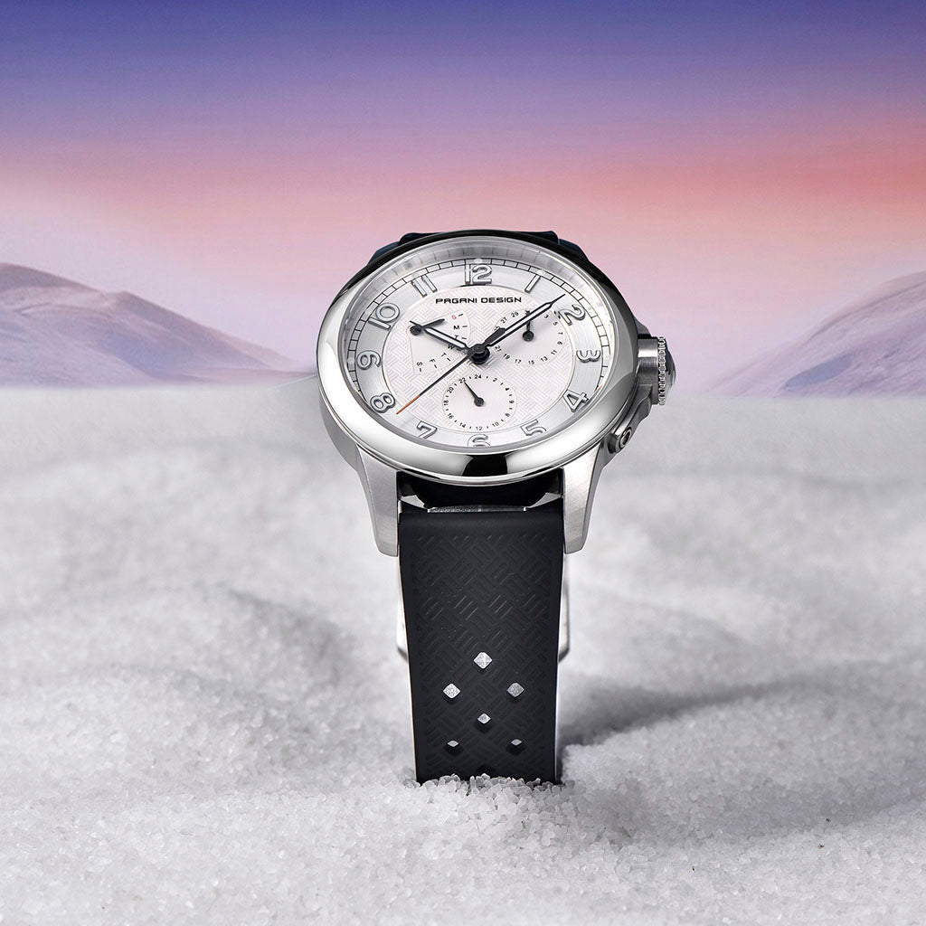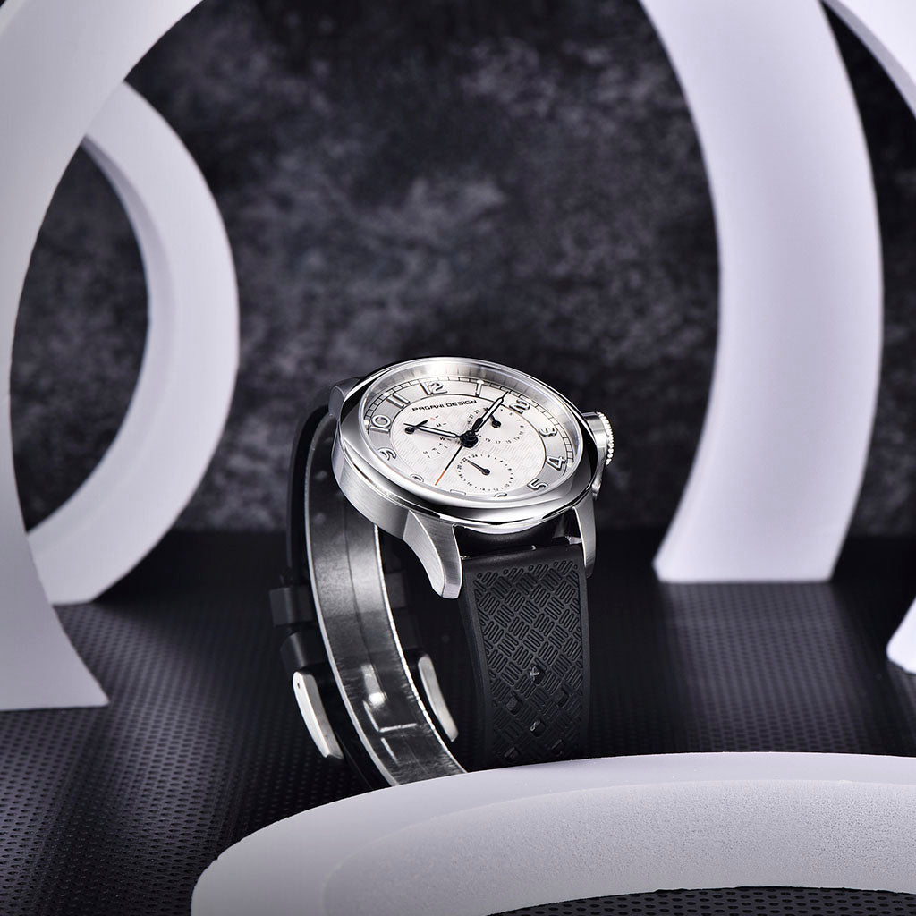 A pulseira do Pagani Design Flow White é cuidadosamente projetada com materiais premium, combinando a resistência e leveza da borracha. Proporciona um conforto incomparável e uma sensação única de estar usando um relógio quase imperceptível no pulso.