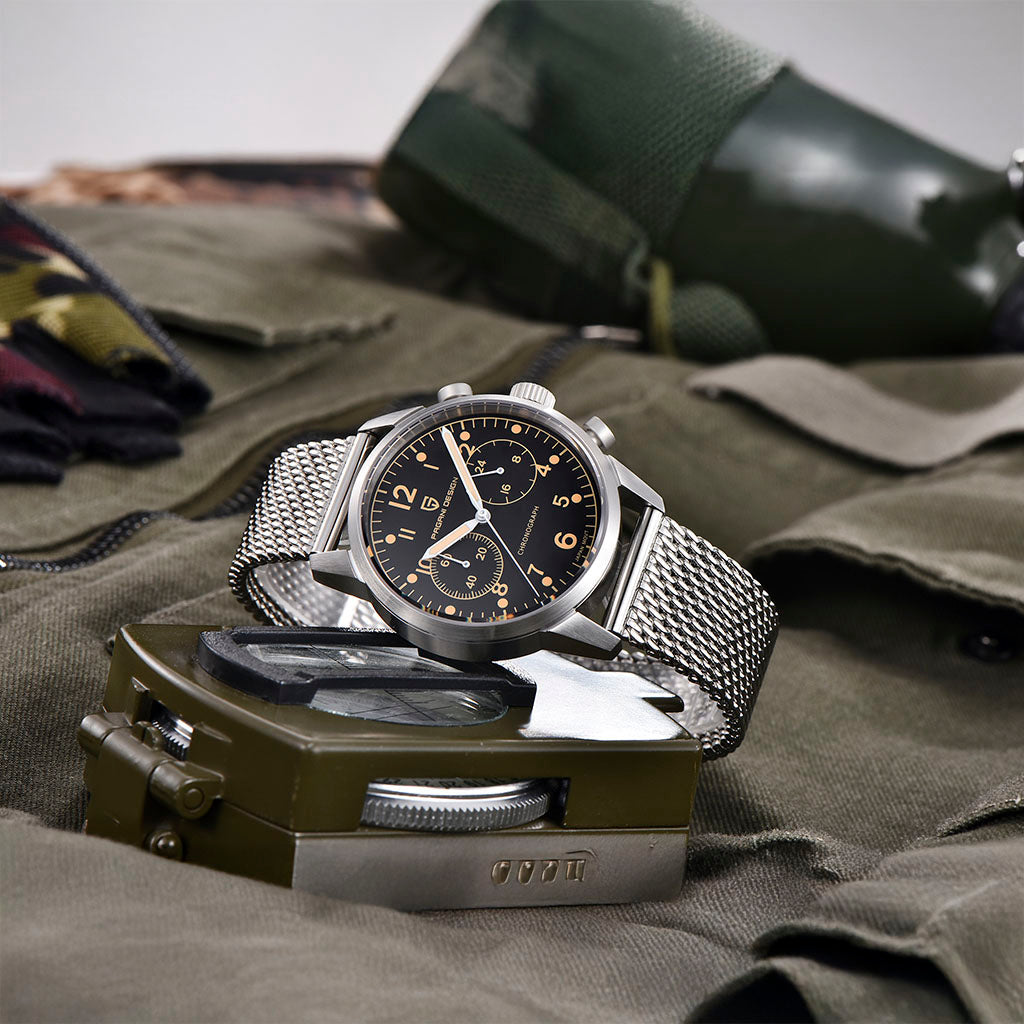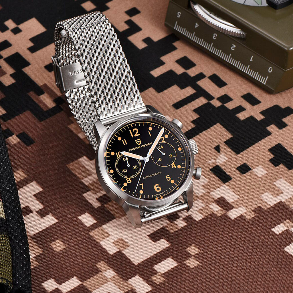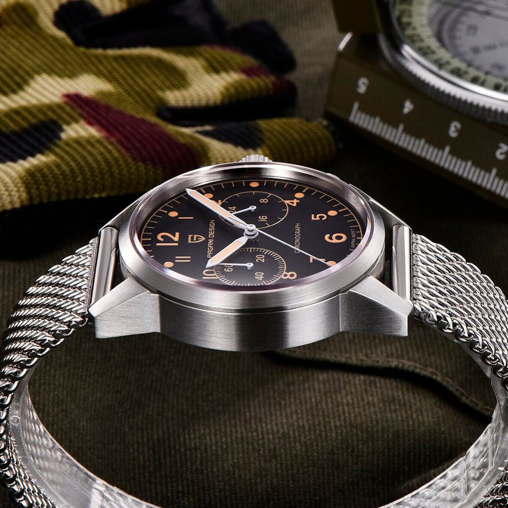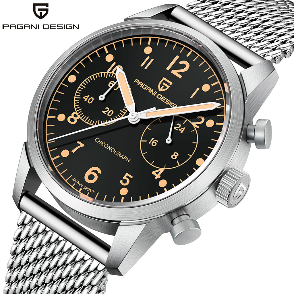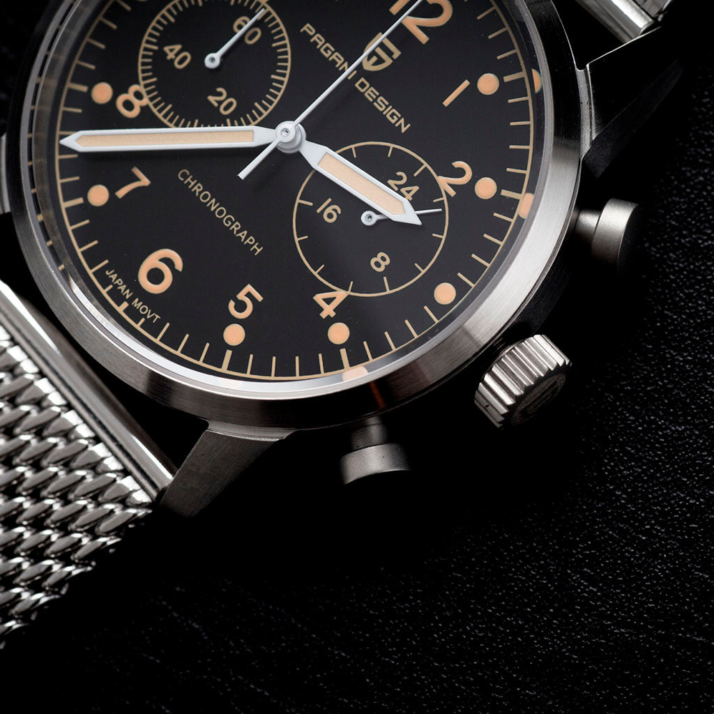 O movimento Seiko VK64 é conhecido por seu desempenho excepcional em termos de precisão e confiabilidade. O Pagani Design Frankfurt Golden Black equipado com o movimento VK64, possui uma operação suave e precisa do cronógrafo.
