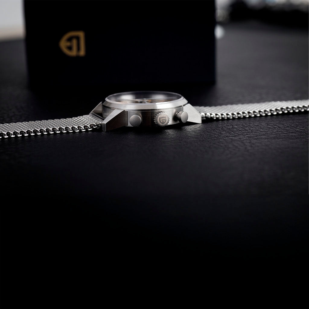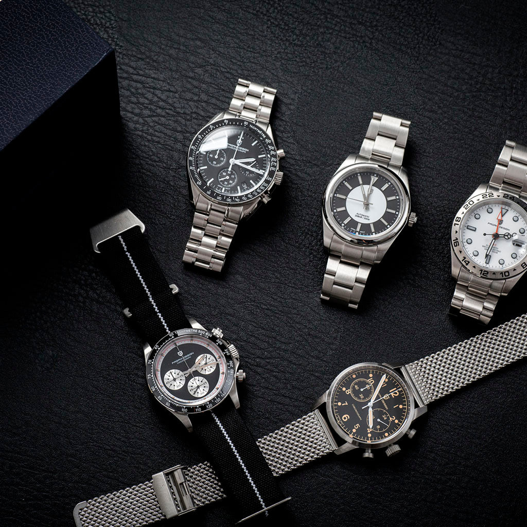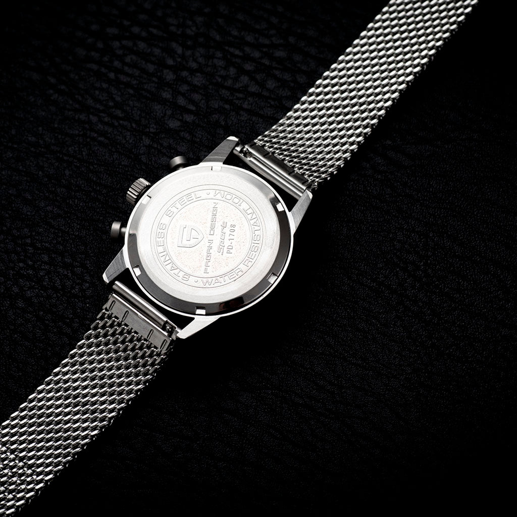 A pulseira do Pagani Design Frankfurt Golden Black é cuidadosamente projetada com materiais premium, combinando a resistência e leveza do aço inoxidável 316L. Proporciona um conforto incomparável e uma sensação única de estar usando um relógio quase imperceptível no pulso.