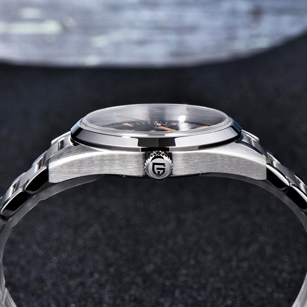 O relógio é resistente à água até 100 metros, proporcionando confiança e tranquilidade durante atividades aquáticas. A coroa do Pagani Design Fusion Black é projetada para garantir uma vedação completa e segura. Consulte o manual de uso e garantia para obter mais informações.