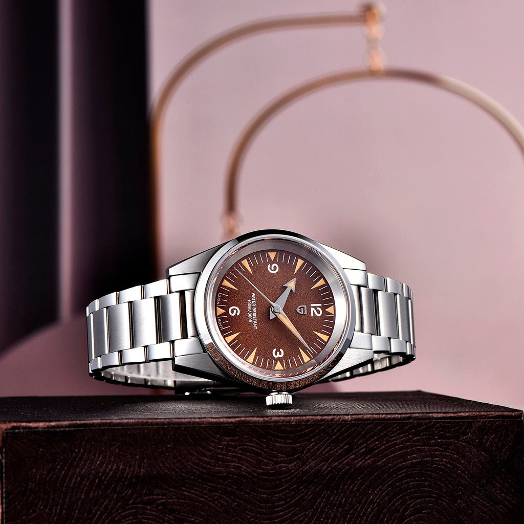 O relógio é resistente à água até 100 metros, proporcionando confiança e tranquilidade durante atividades aquáticas. A coroa do Pagani Design Fusion Brown é projetada para garantir uma vedação completa e segura. Consulte o manual de uso e garantia para obter mais informações.