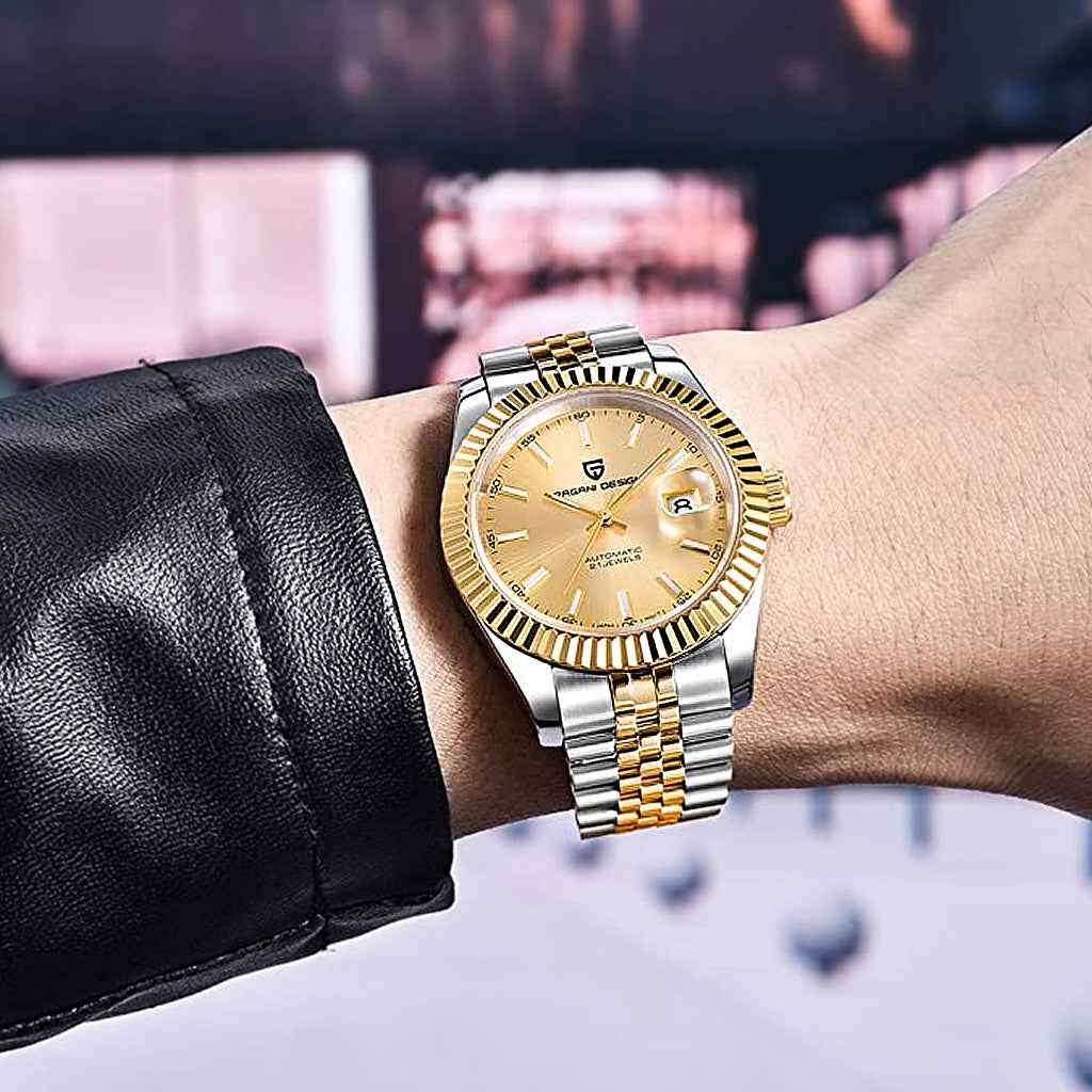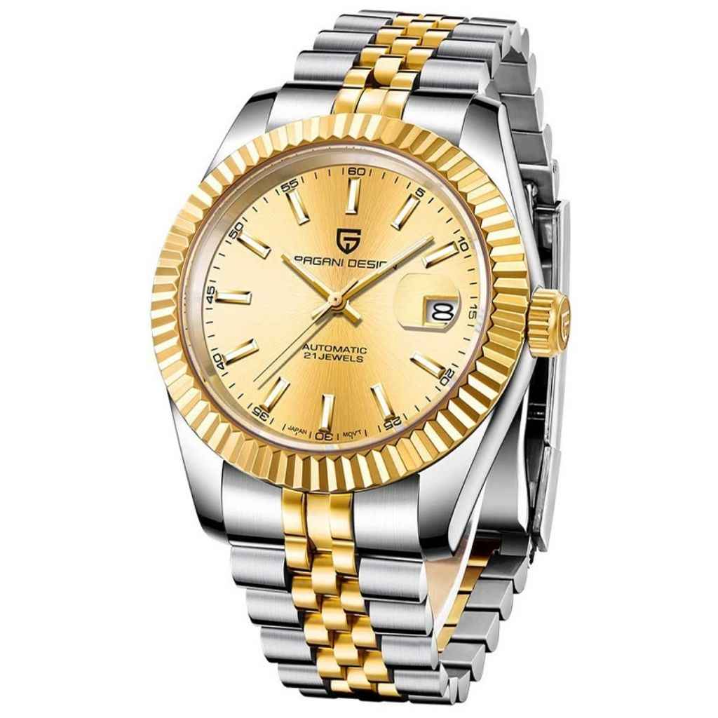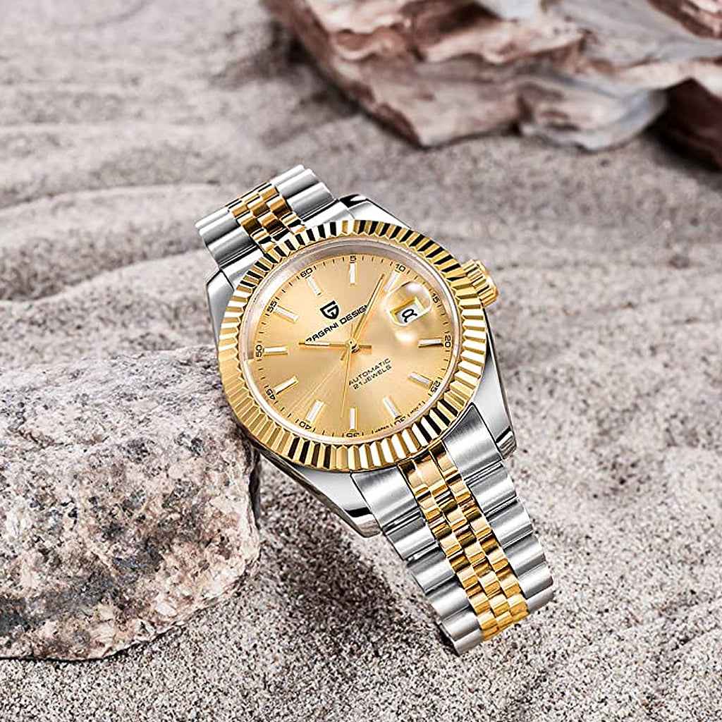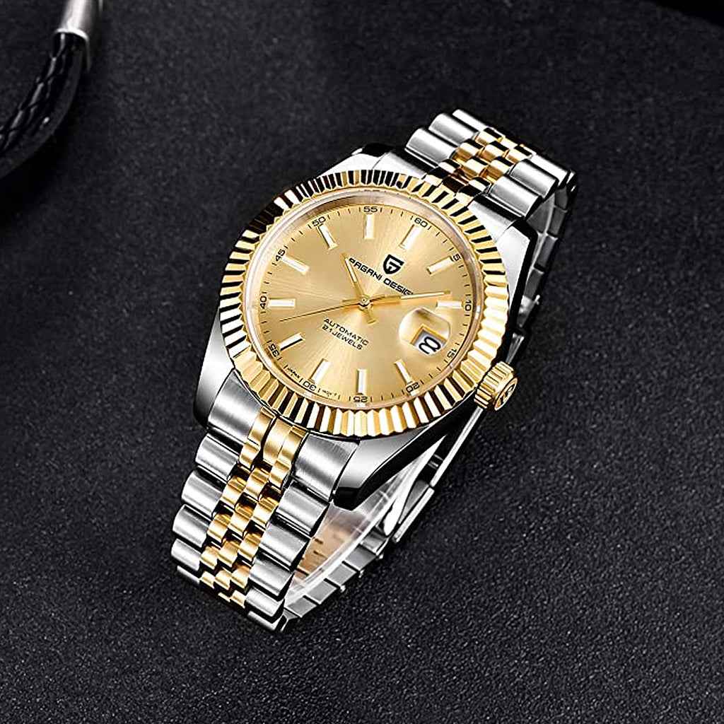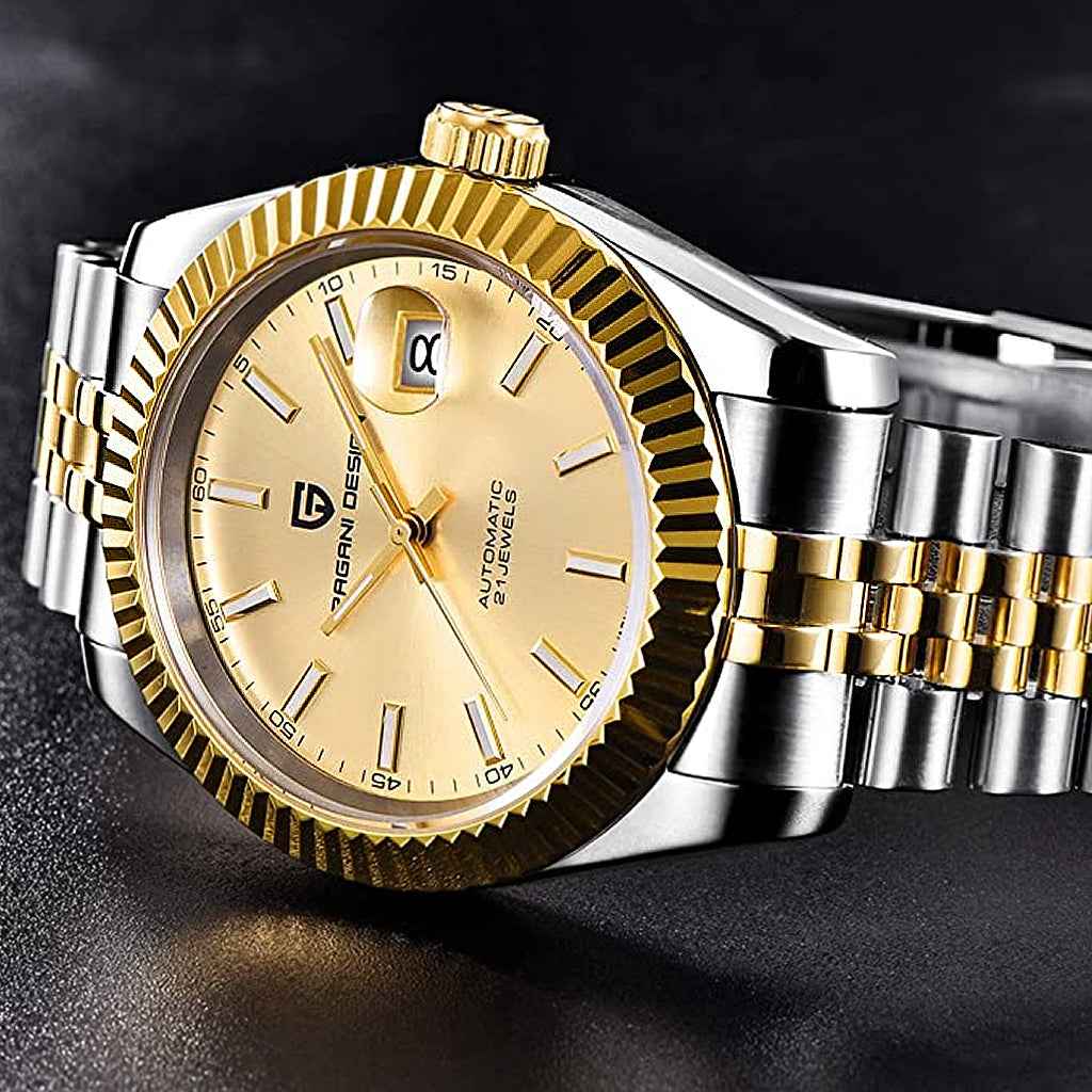 The watch uses Seiko NH35A movement, an enhanced version of the seiko NH25, renowned for its exceptional performance in terms of accuracy and reliability. The Pagani Design Giovanni Gold, equipped with the NH35A movement, features an impressive power reserve of approximately 45 hours.