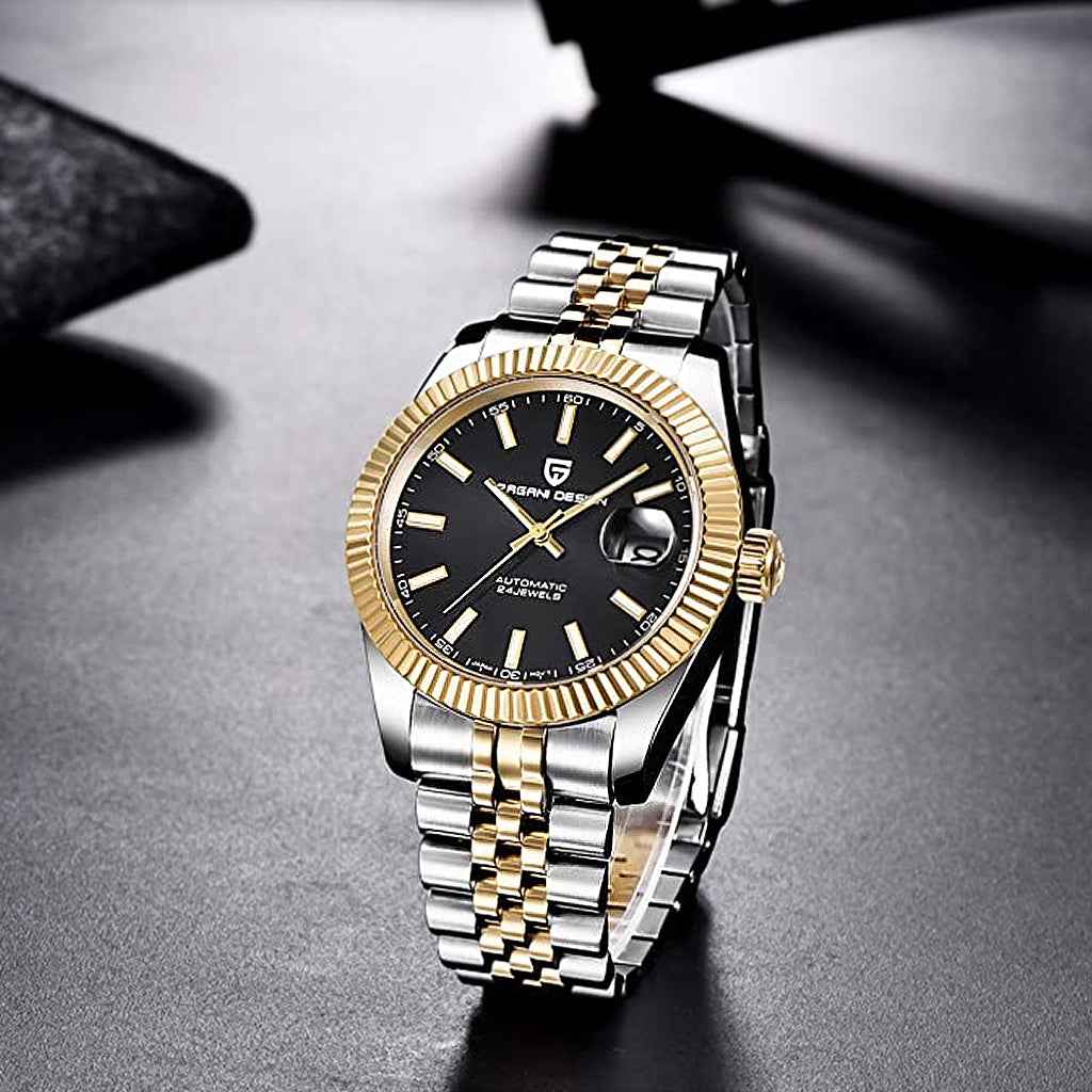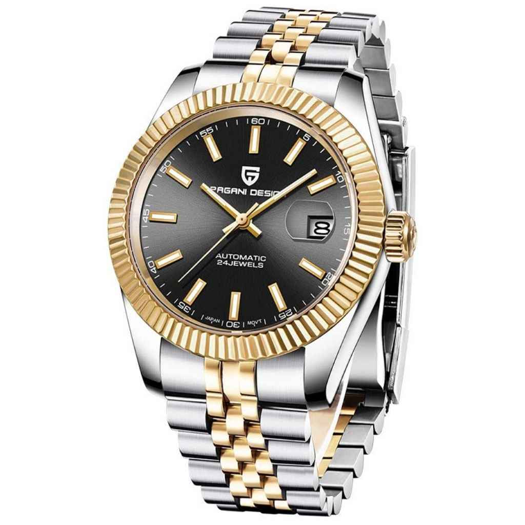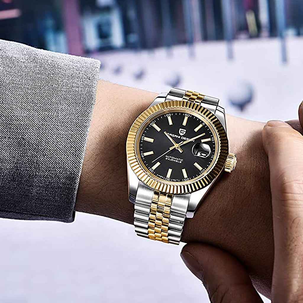 The watch uses Seiko NH35A movement, an enhanced version of the seiko NH25, renowned for its exceptional performance in terms of accuracy and reliability. The Pagani Design Giovanni Gold Black, equipped with the NH35A movement, features an impressive power reserve of approximately 45 hours.