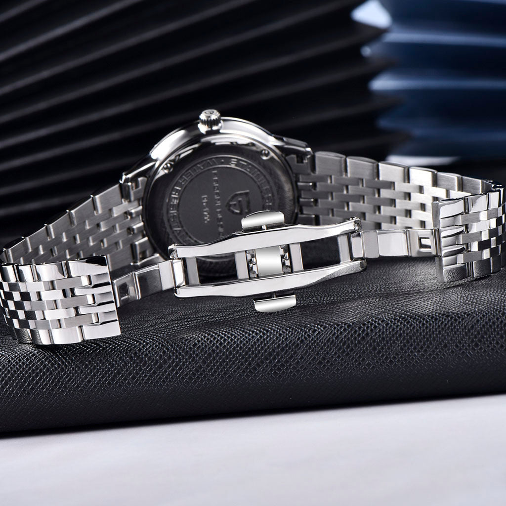 A pulseira do Pagani Design Martin Black é cuidadosamente projetada com aço inoxidável 316L, combinando a resistência do aço e a leveza do metal. Proporciona um conforto incomparável e uma sensação única de estar usando um relógio quase imperceptível no pulso.