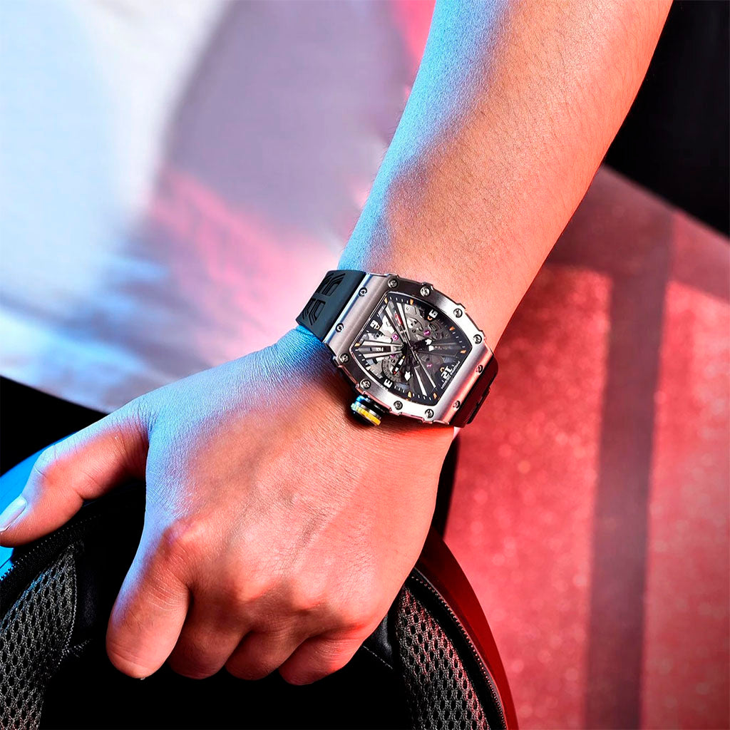 A pulseira do Pagani Design Monza Silver Black é cuidadosamente projetada com materiais premium, com toda a resistência e leveza do FKM. Proporciona um conforto incomparável e uma sensação única de estar usando um relógio quase imperceptível no pulso.