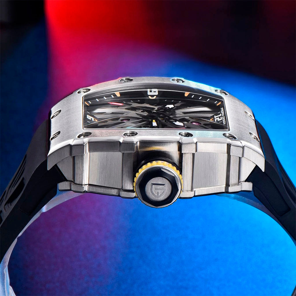 O Pagani Design Monza Silver Black é resistente à água até 100 metros, proporcionando confiança e tranquilidade durante atividades aquáticas. A coroa do Pagani Design Monza Silver Black é rosqueada para garantir uma vedação completa e segura. Consulte o manual de uso e garantia para obter mais informações.