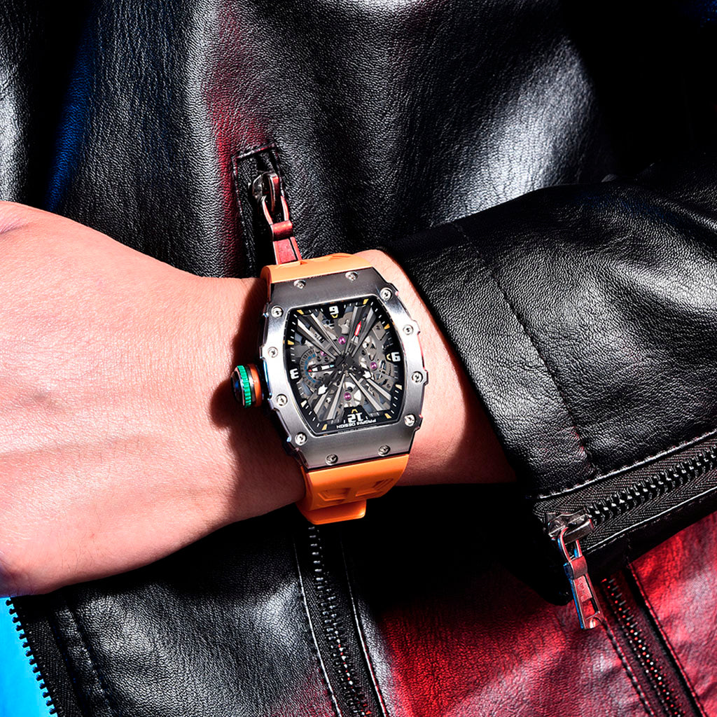 O Pagani Design Monza Silver Orange é fabricado com aço inoxidável 316L, um material antialérgico e altamente resistente à corrosão, oferecendo resistência, brilho e durabilidade excepcionais.