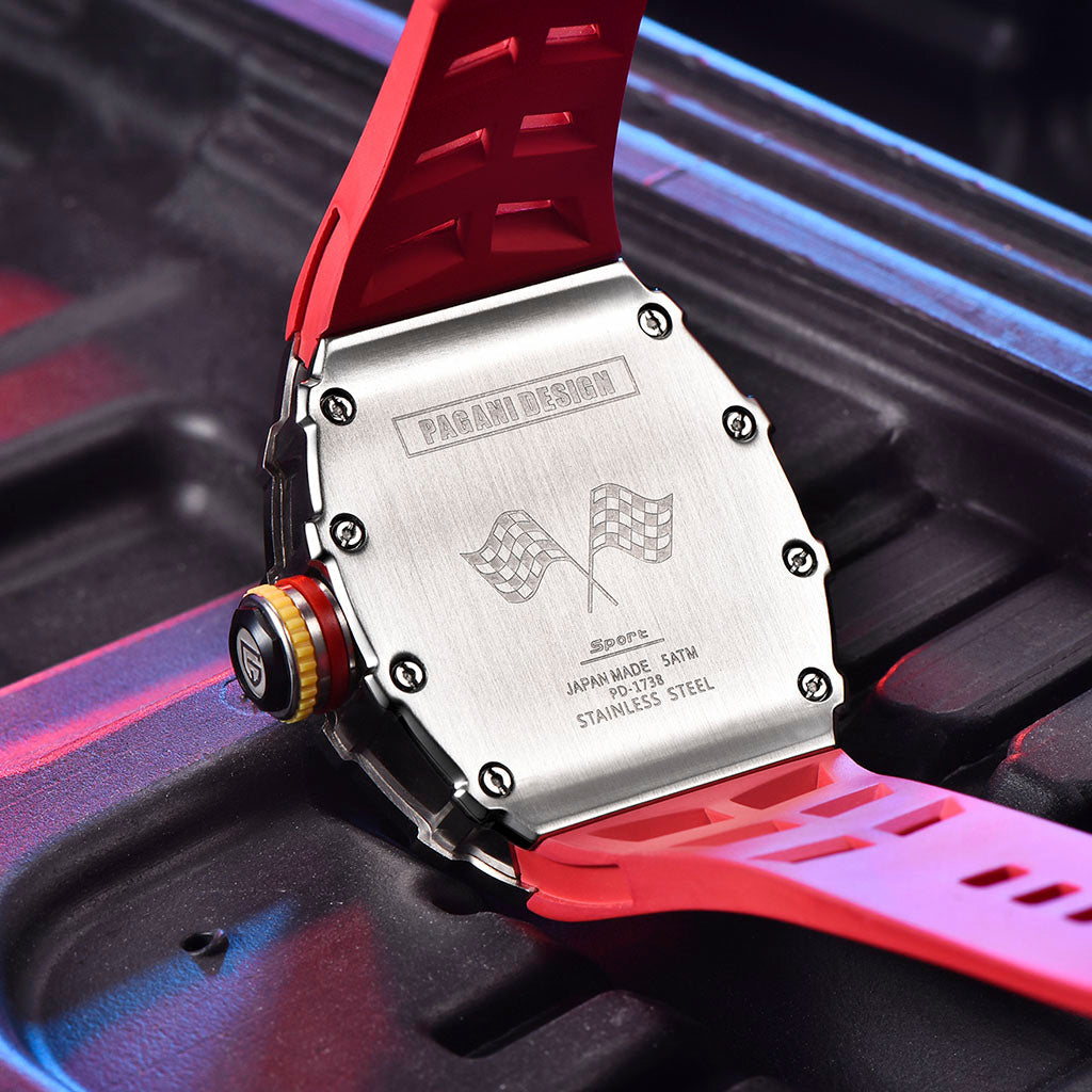O Pagani Design Monza Silver Red é resistente à água até 100 metros, proporcionando confiança e tranquilidade durante atividades aquáticas. A coroa do Pagani Design Monza Silver Red é rosqueada para garantir uma vedação completa e segura. Consulte o manual de uso e garantia para obter mais informações.