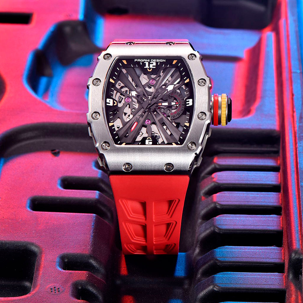O Pagani Design Monza Silver Red é fabricado com aço inoxidável 316L, um material antialérgico e altamente resistente à corrosão, oferecendo resistência, brilho e durabilidade excepcionais.