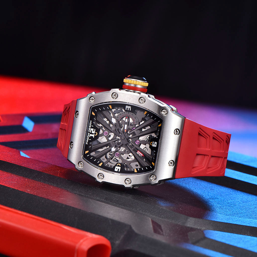 O relógio Pagani Design Monza Silver Red utiliza cristal de safira, um dos materiais mais prestigiados no mundo da alta relojoaria, conhecido por sua transparência e durabilidade excepcionais.