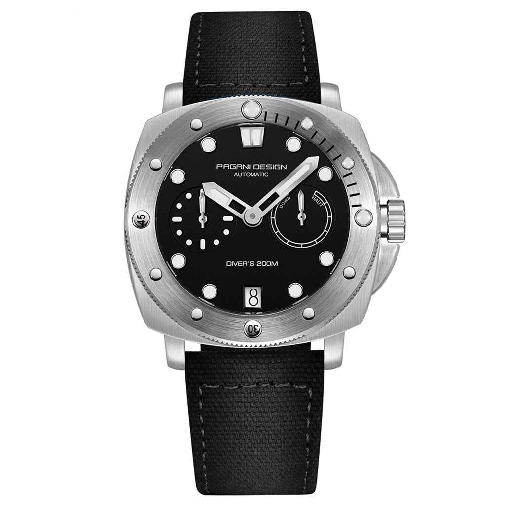 The Pagani Design Numberg Black watch is water-resistant up to 200 meters, providing confidence and peace of mind during aquatic activities. The crown of the Pagani Design Numberg Black is screw-down to ensure a complete and secure seal. Please refer to the user manual and warranty for more information.