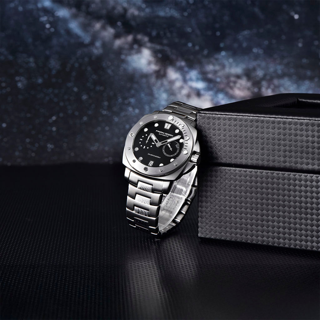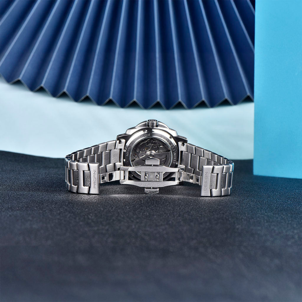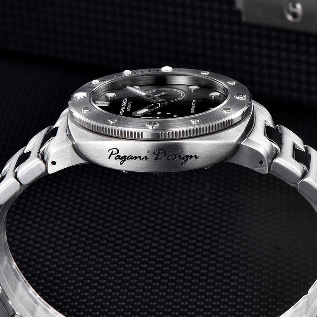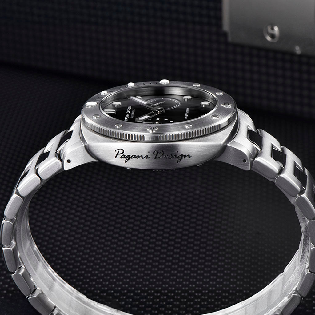 A pulseira do Pagani Design Numberg Black City Edition é cuidadosamente projetada com materiais premium, combinando a resistência e a leveza do aço 316L. Proporciona um conforto incomparável e uma sensação única de estar usando um relógio quase imperceptível no pulso.