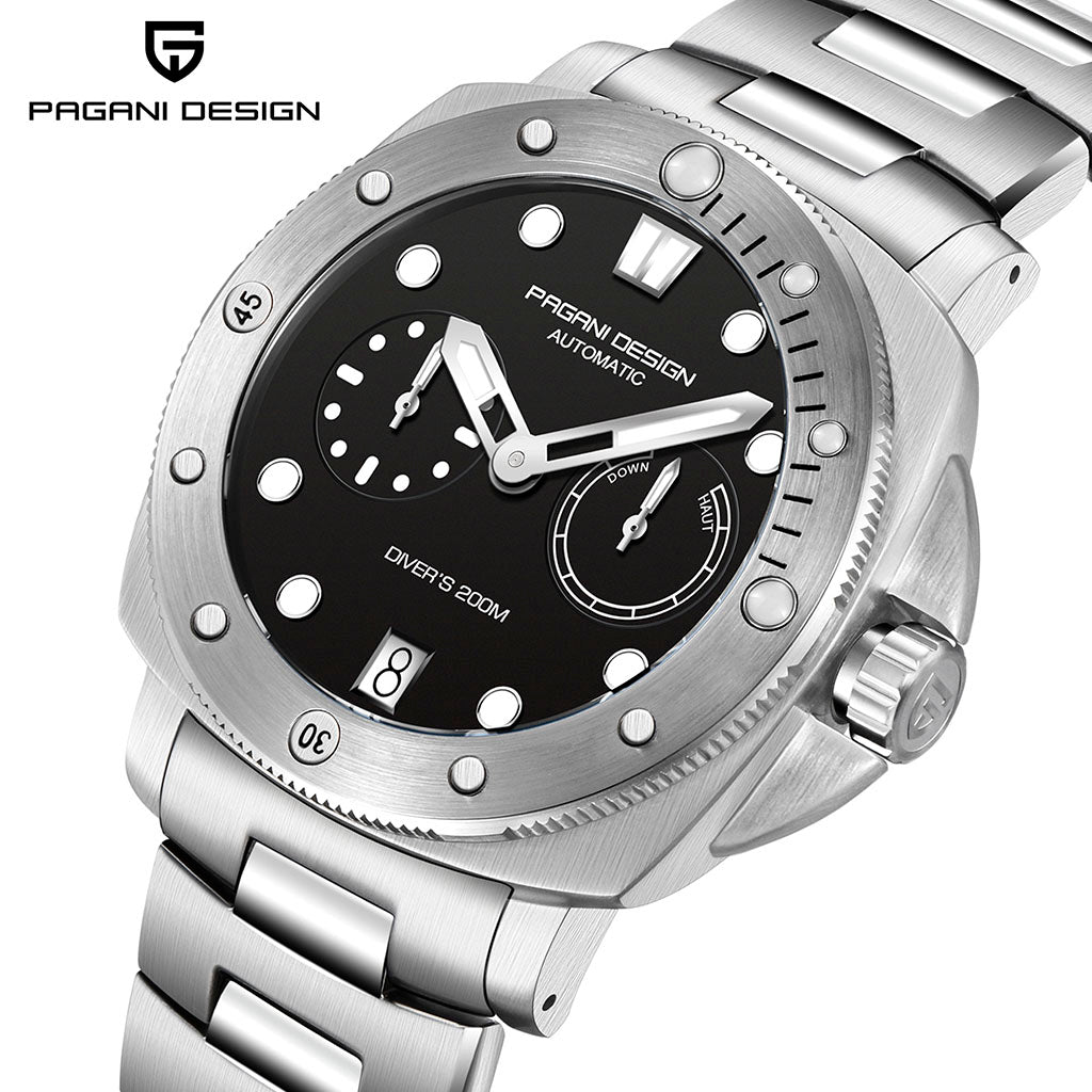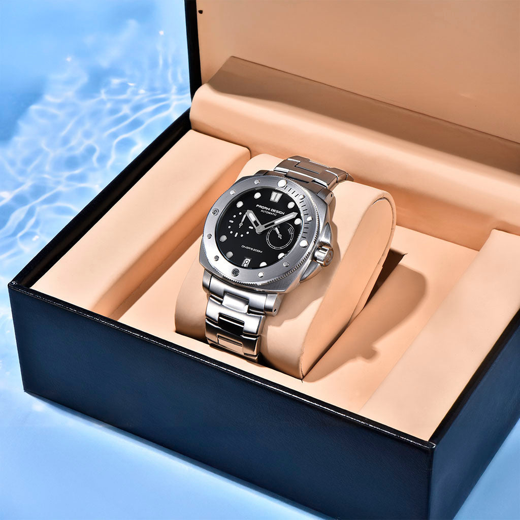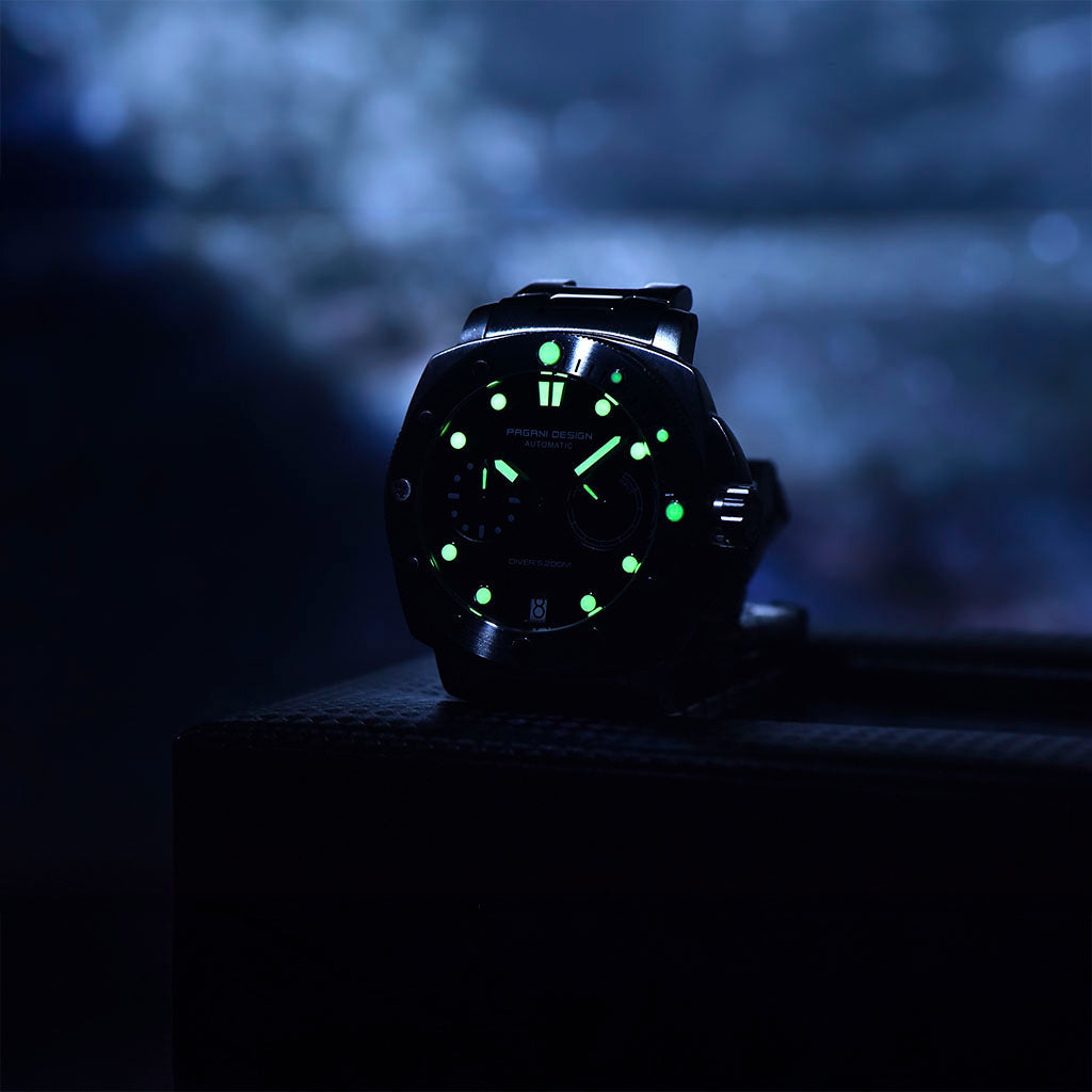 O Pagani Design Numberg Black City Edition é resistente à água até 200 metros, proporcionando confiança e tranquilidade durante atividades aquáticas. A coroa do Pagani Design Numberg Black City Edition é rosqueada para garantir uma vedação completa e segura. Consulte o manual de uso e garantia para obter mais informações.