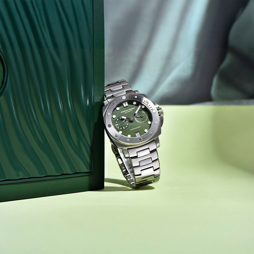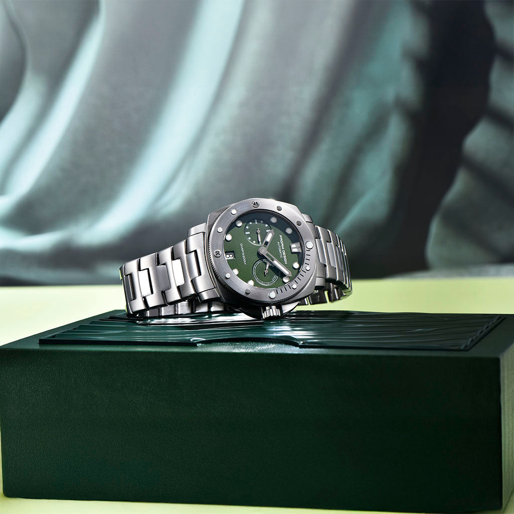 A pulseira do Pagani Design Numberg Green City Edition é cuidadosamente projetada com materiais premium, combinando a resistência e a leveza do aço 316L. Proporciona um conforto incomparável e uma sensação única de estar usando um relógio quase imperceptível no pulso.