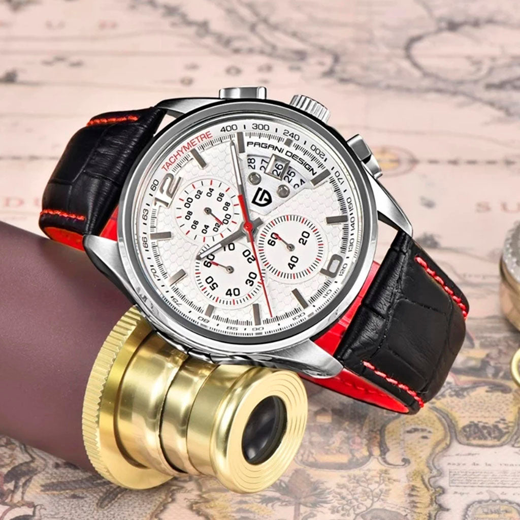 O modelo Pagani Design Pace White é equipado com sistema de cronógrafo e marcador de data com toda a precisão de um modelo Quartzo. Além disso possui toda a qualidade e beleza de um modelo Pagani Design.