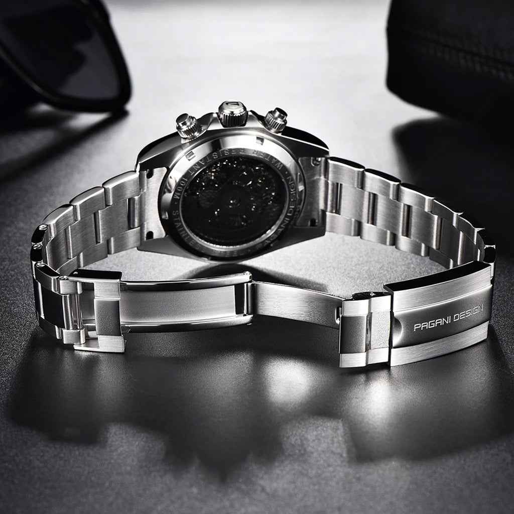 The Pagani Design Rainbow watch is water-resistant up to 100 meters, providing confidence and peace of mind during aquatic activities. The Pagani Design Rainbow features a screw-down crown to ensure a complete and secure seal. Please refer to the user manual and warranty for more information.