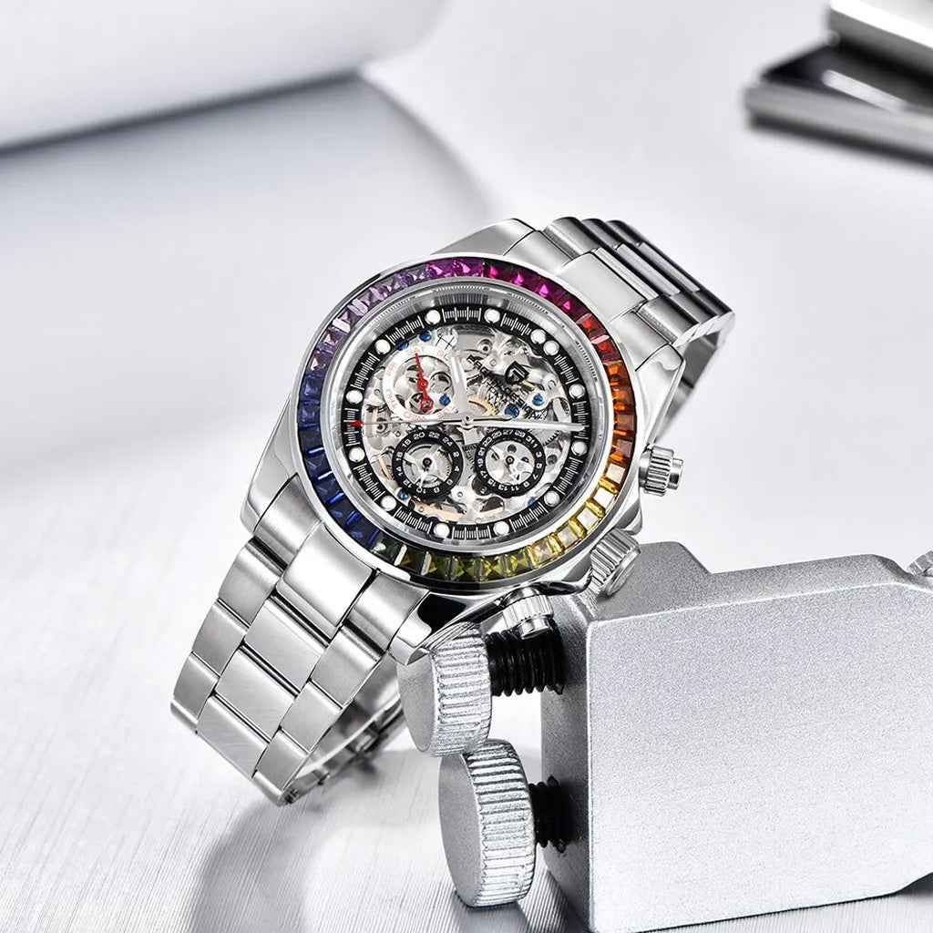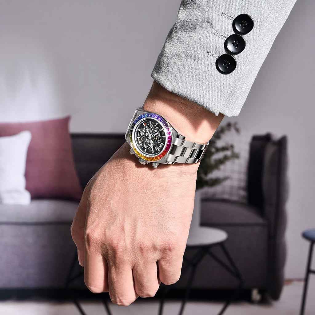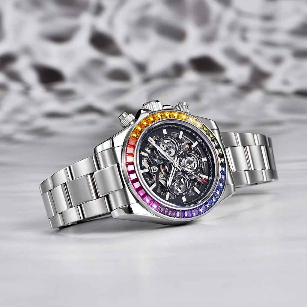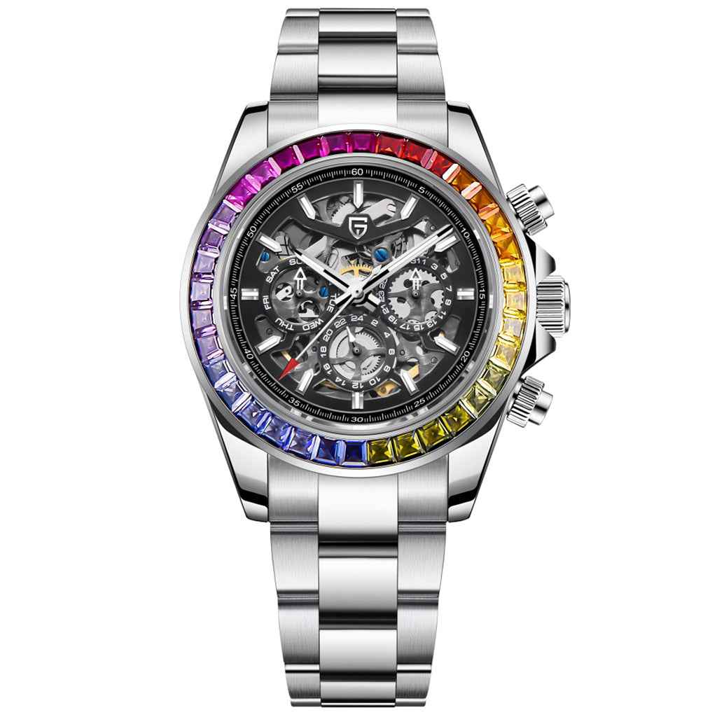 The Pagani Design Rainbow watch features sapphire crystal, one of the most prestigious materials in the world of fine watchmaking, renowned for its exceptional clarity and durability.