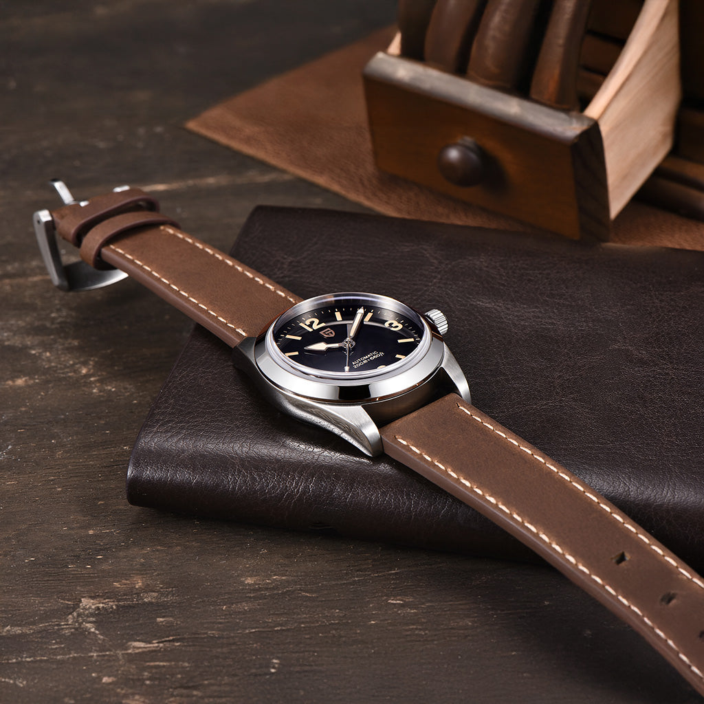 A pulseira do Pagani Design Ranger Black Classic Edition é cuidadosamente projetada com couro legítimo, combinando a resistência e a leveza do material. Proporciona um conforto incomparável e uma sensação única de estar usando um relógio quase imperceptível no pulso.