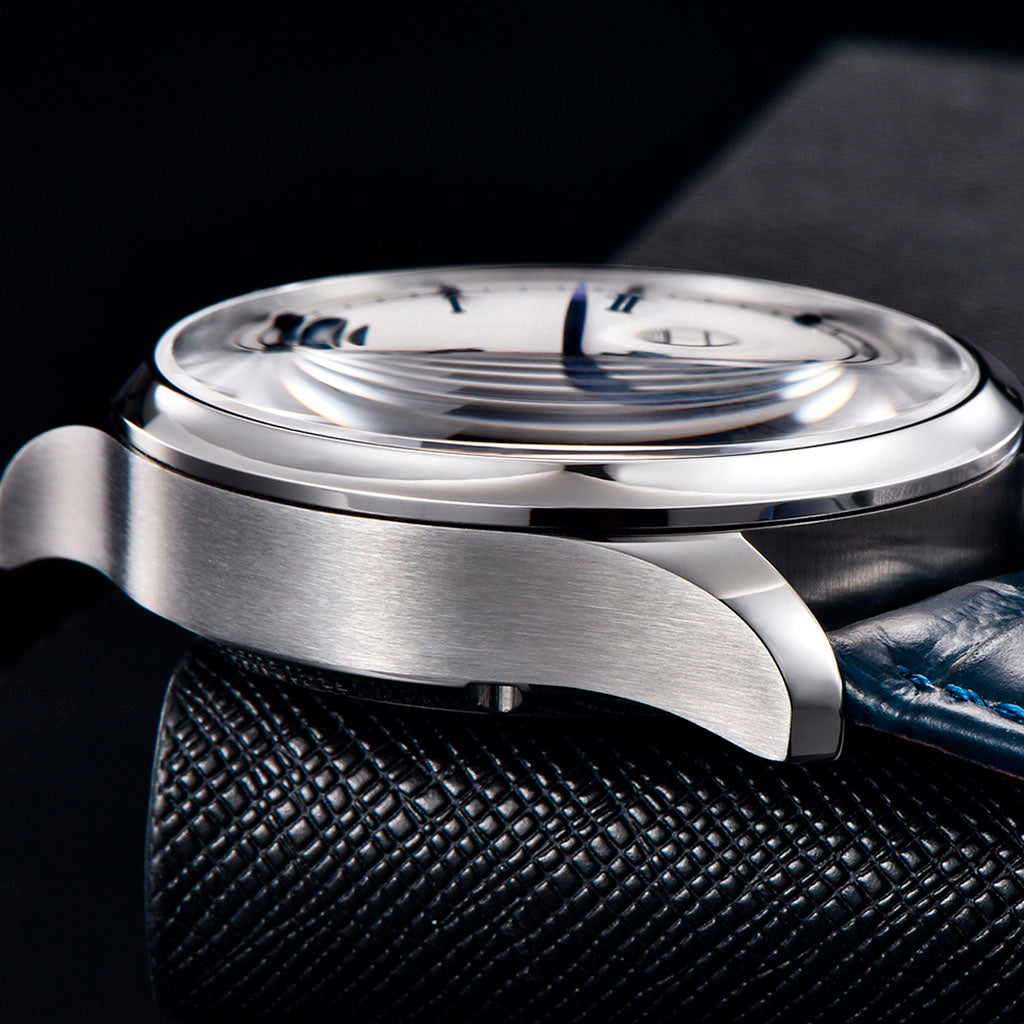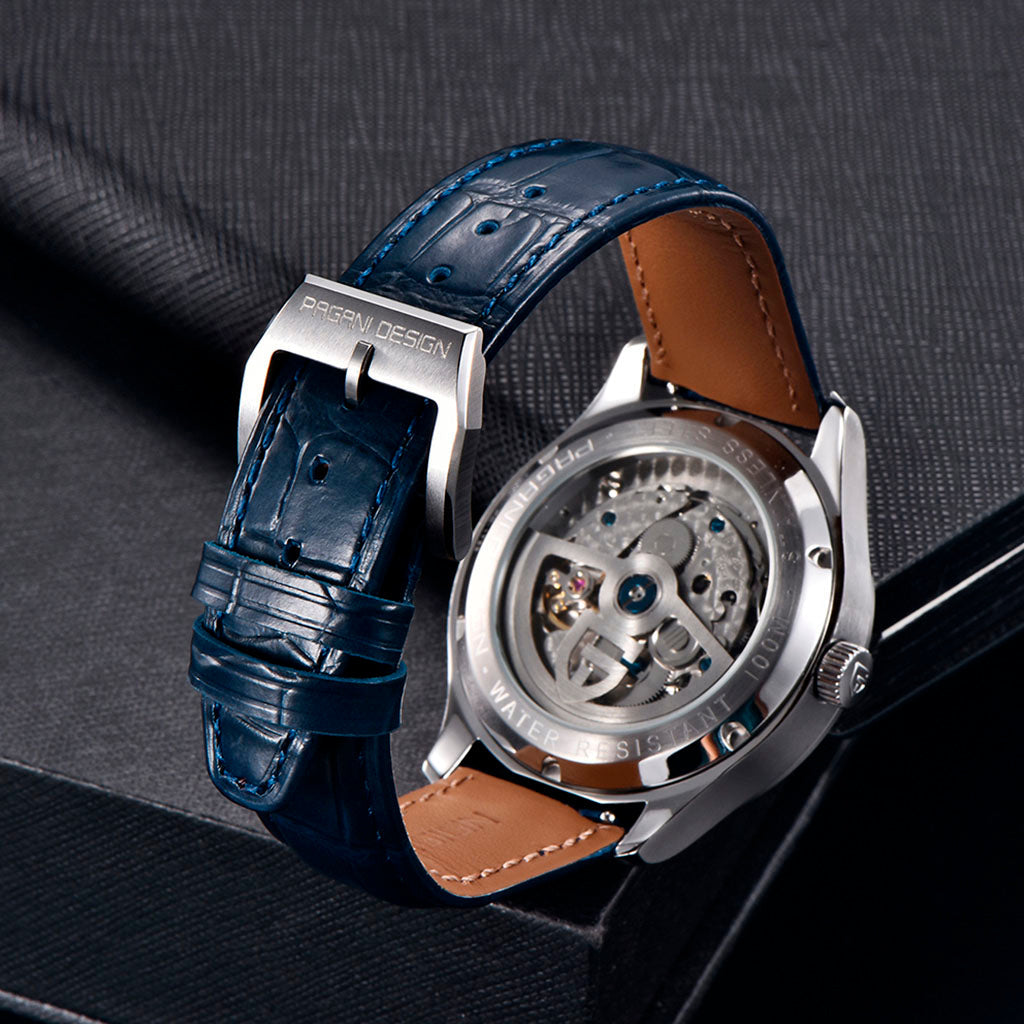 A pulseira do Pagani Design Roma Blue Classic Edition é cuidadosamente projetada com couro legítimo com toda a resistência e a leveza do material. Proporciona um conforto incomparável e uma sensação única de estar usando um relógio quase imperceptível no pulso.