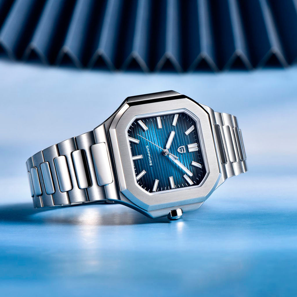 O relógio Pagani Design Square Blue utiliza cristal de safira sintético, um dos materiais mais prestigiados no mundo da alta relojoaria, conhecido por sua transparência e durabilidade excepcionais.