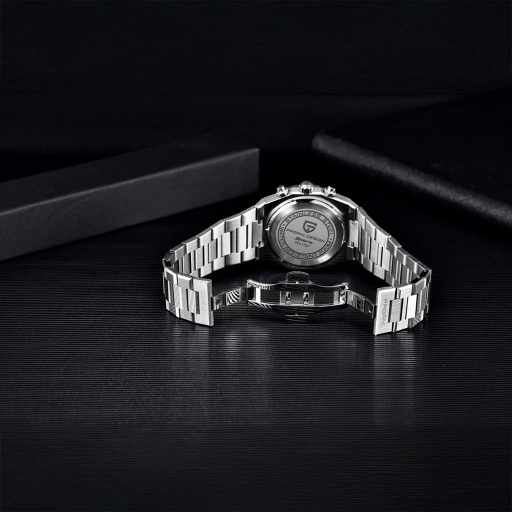 A pulseira do Pagani Design Track Black é cuidadosamente projetada com materiais premium, combinando a resistência e leveza do aço inoxidável 316L. Proporciona um conforto incomparável e uma sensação única de estar usando um relógio quase imperceptível no pulso.