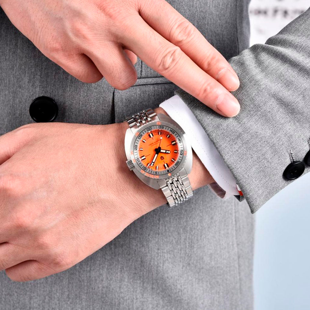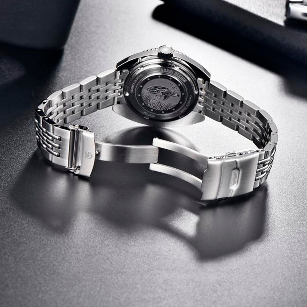 A pulseira do Pagani Design Turtle Orange é cuidadosamente projetada com materiais premium, combinando a resistência e leveza do aço inoxidável 316L. Proporciona um conforto incomparável e uma sensação única de estar usando um relógio quase imperceptível no pulso.